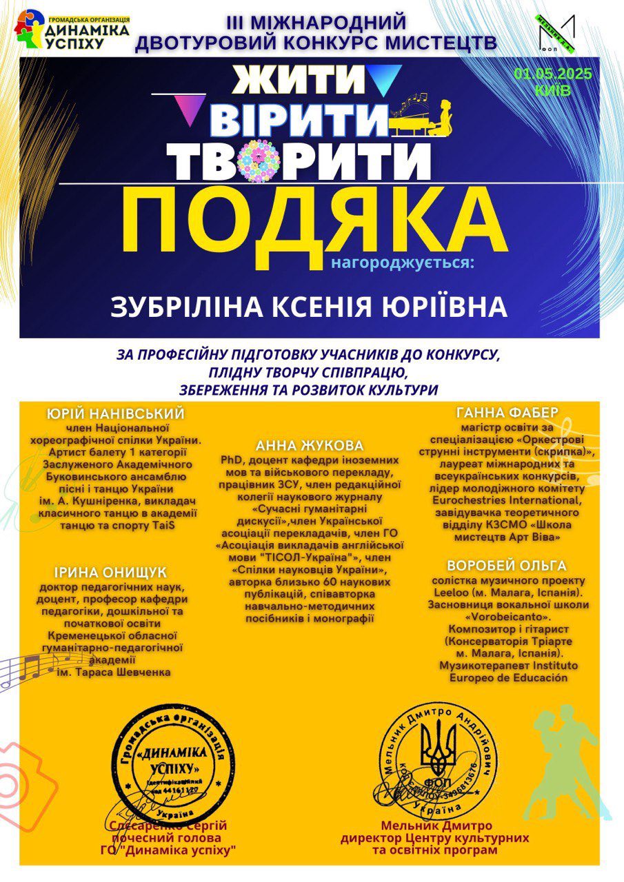 Викладача Ксенію Юріївну Зубріліну було відзначено подякою за професійну підготовку учасниці до конкурсу, плідну творчу співпрацю, збереження та розвиток культури.