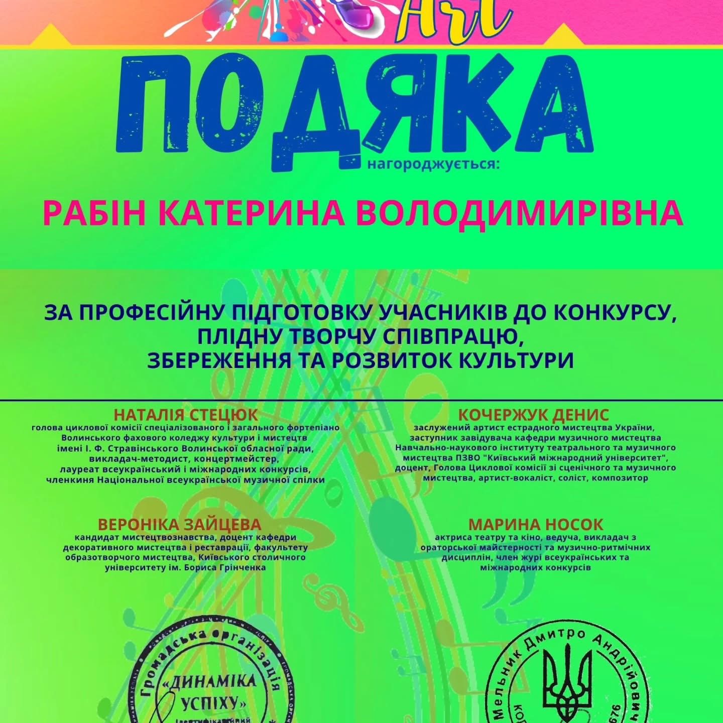 Викладача було нагороджено подякою за професійну підготовку учасниць до конкурсу, плідну творчу співпрацю, збереження та розвиток культури.